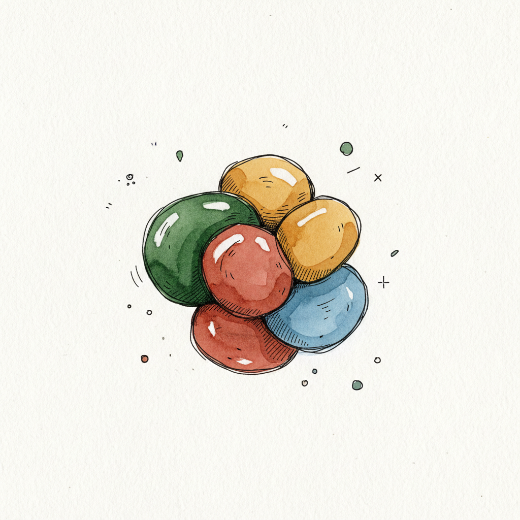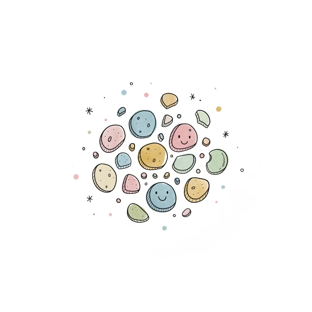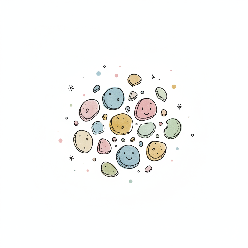 Handgezeichnete, bunte, runde und ovale Objekte, die an Kieselsteine oder Bonbons erinnern.