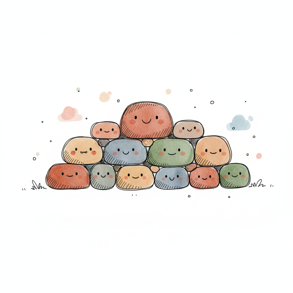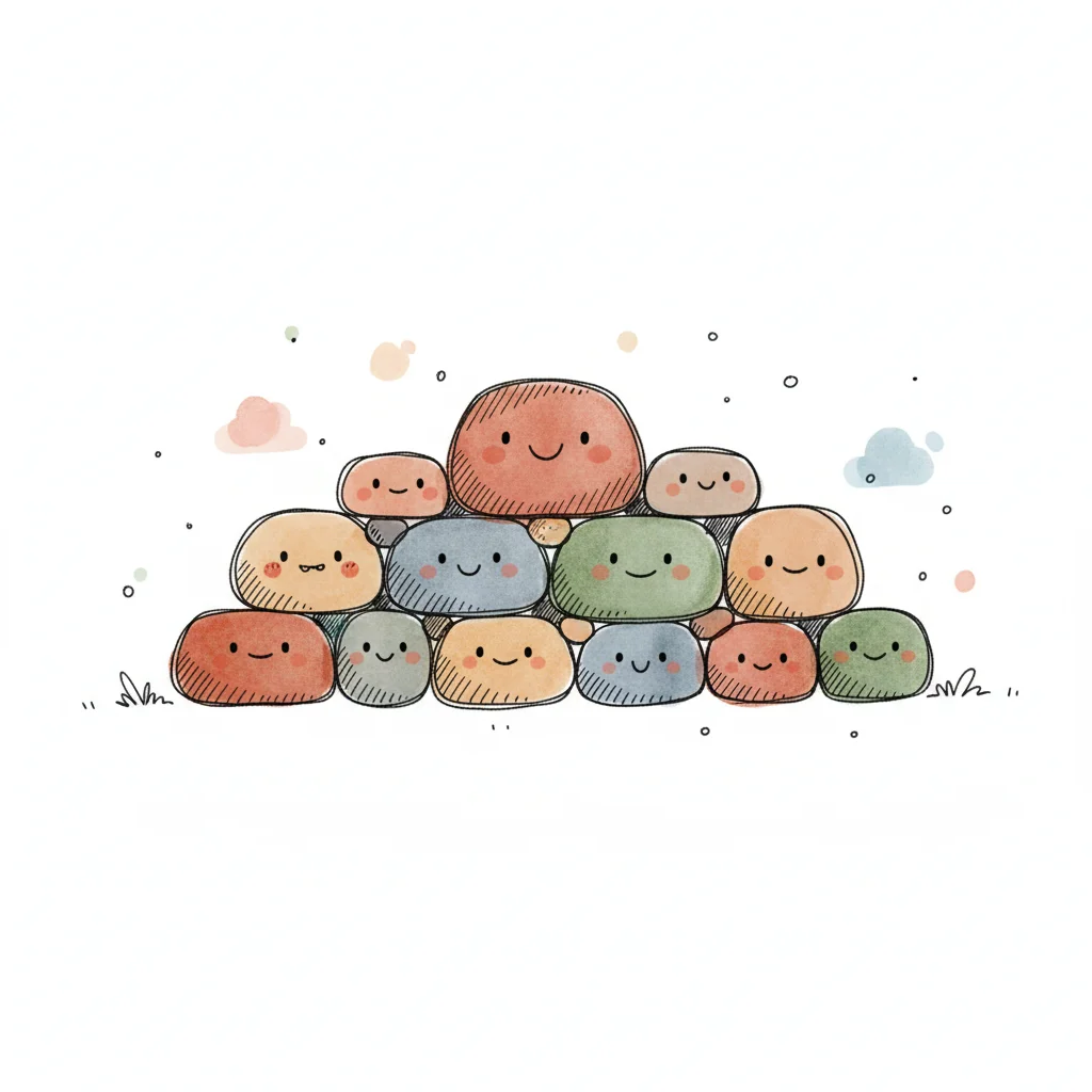 Ein fröhlicher, oranger Blob mit Wangenrot, umgeben von grauen Steinen im Aquarell-Cartoon-Stil.