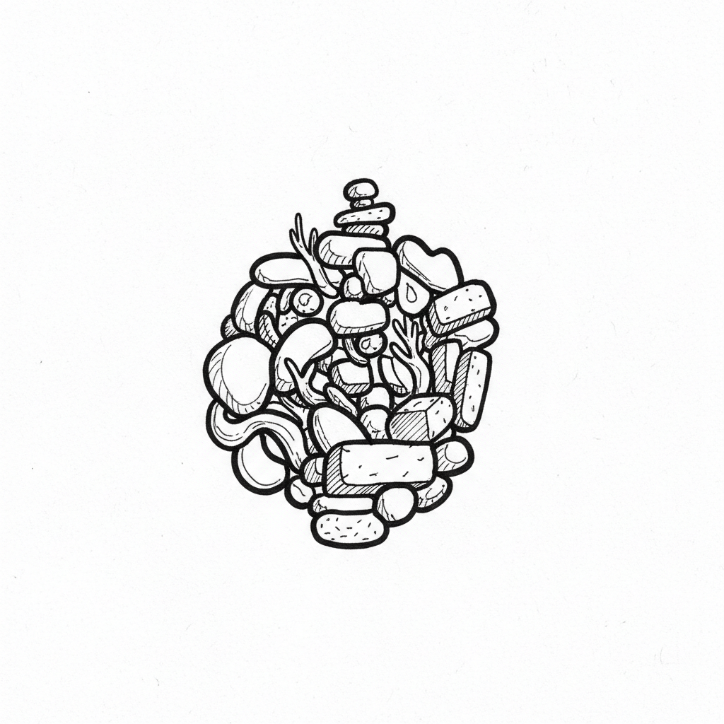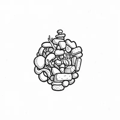 Schwarz-weiße Skizze einer dichten Ansammlung von Steinen, Kieselsteinen und organischen Formen.