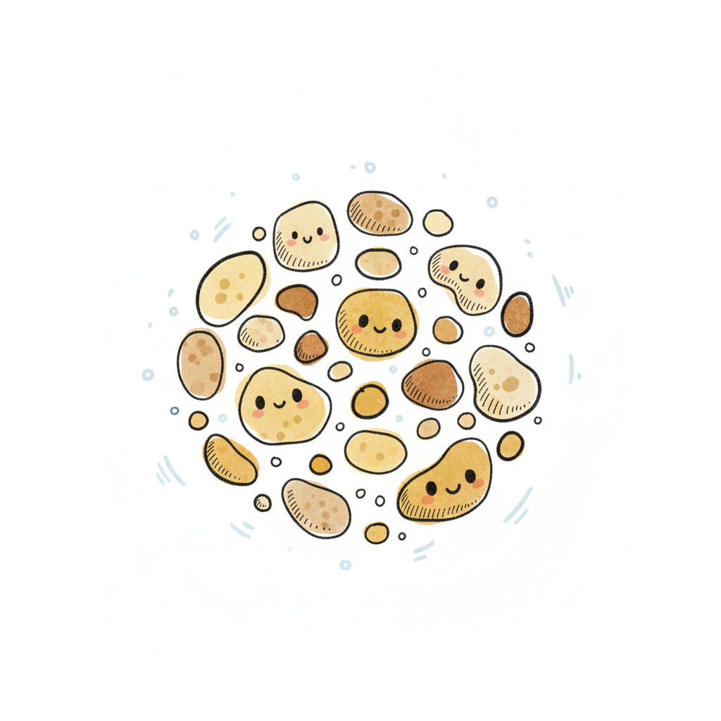Niedliche, lächelnde Kieselsteine in verschiedenen Formen und Brauntönen, umgeben von kleinen Blasen.