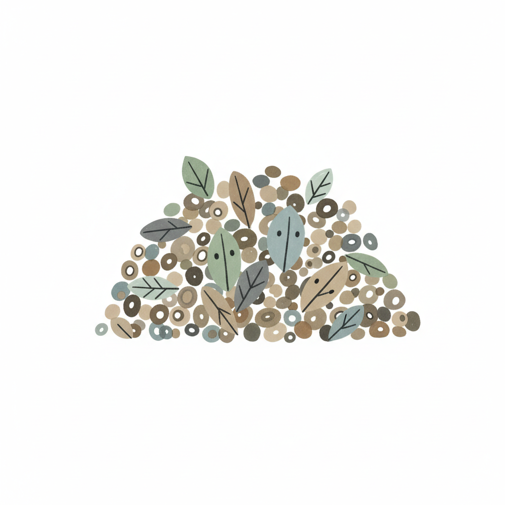 Illustration einer Ansammlung von Kieselsteinen und Blättern in gedeckten Naturfarben.
