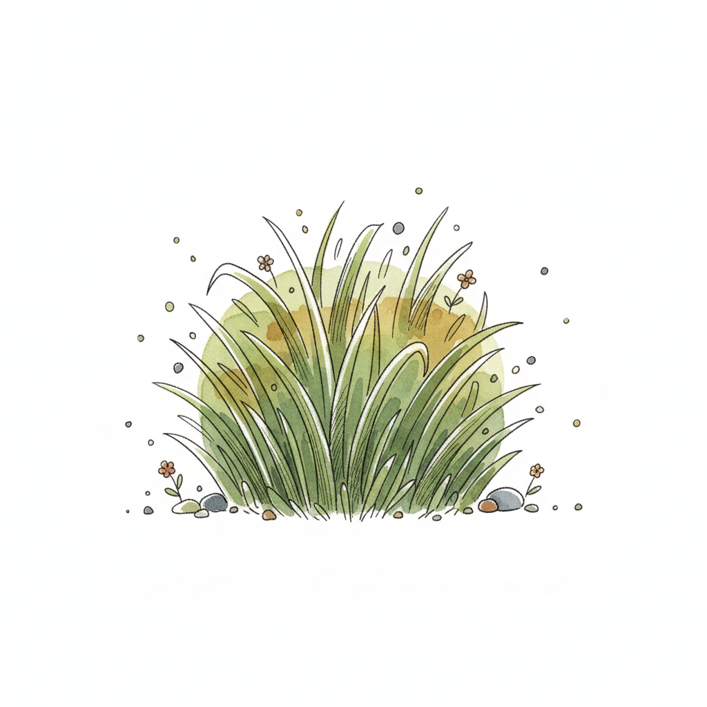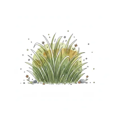 Niedliche Aquarellzeichnung eines Grasbüschels mit zarten Blüten und Kieselsteinen auf weißem Grund.