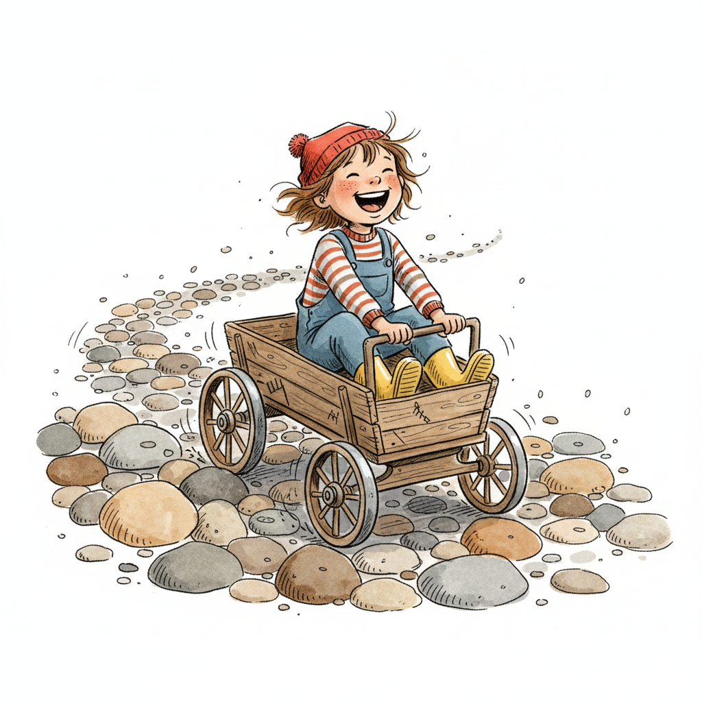 Glückliches Kind in roter Mütze und Latzhose fährt lachend in einem Holzwagen auf Kieselsteinen.