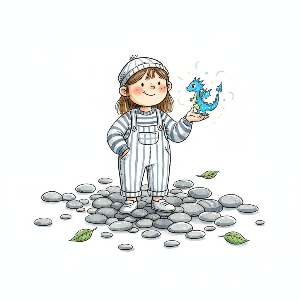 Ein süßes Mädchen hält einen kleinen, blauen Drachen in der Hand, stehend auf Kieselsteinen.