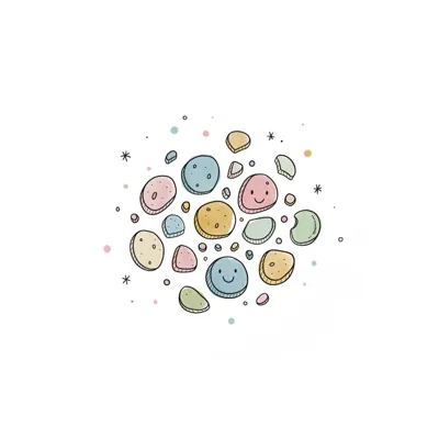 Bunte, handgezeichnete Kieselsteine oder Kekse mit lächelnden Gesichtern in Pastellfarben.