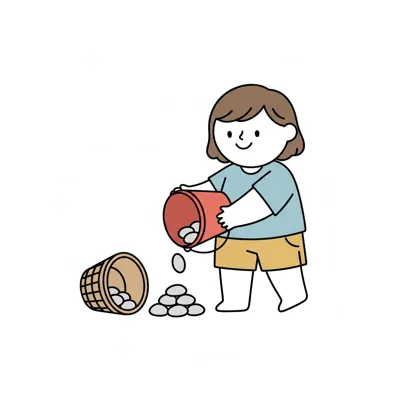 Ein lächelndes Mädchen schüttet Kieselsteine aus einem Eimer auf den Boden neben einem Korb.