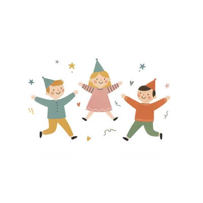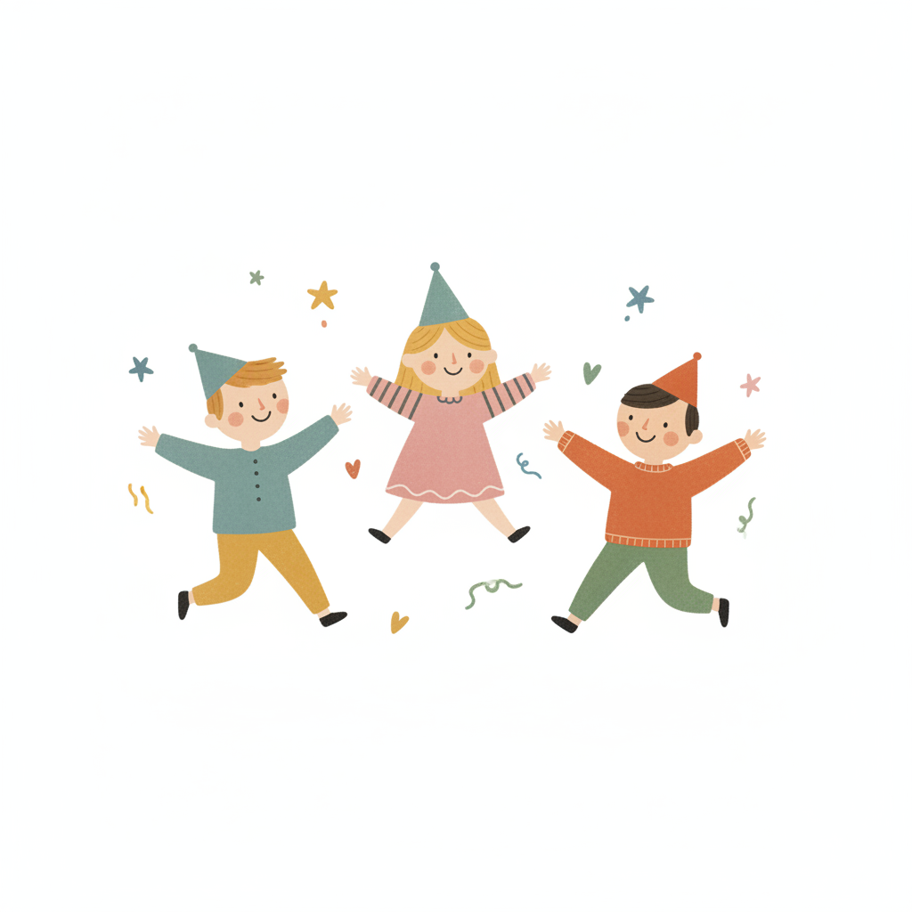 Drei fröhliche Kinder in Partyhüten tanzen und haben Spaß.