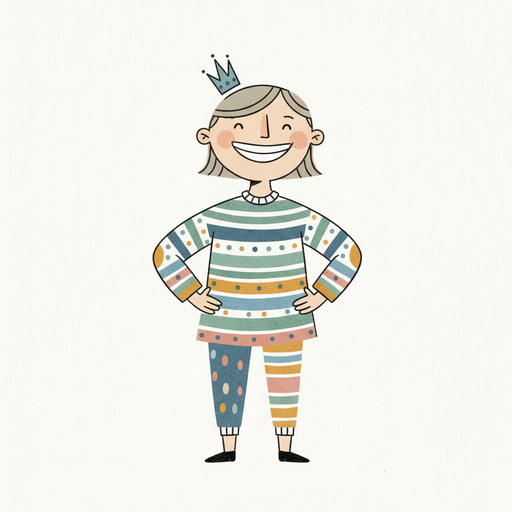 Handgezeichnete Kinderbuchillustration im modernen skandinavisch-nordischen Stil. Minimalistische, freundliche Figur mit einfachen Formen und leicht unregelmäßigen, handgezeichneten Linien. Ruhige, gedeckte Farbpalette, viel freie Fläche, reduzierte Details, sanfte Papier- oder Aquarellstruktur. Warme, ruhige, leicht humorvolle Stimmung, flächige Komposition ohne starke Perspektive, moderner nordischer Illustrationsstil, charmant und zeitlos.
