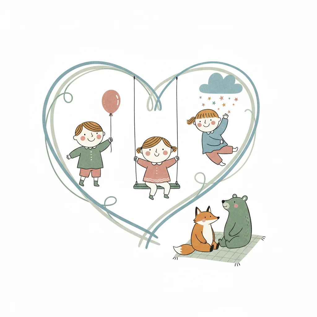Kinder spielen in einem herzförmigen Rahmen mit Tieren.