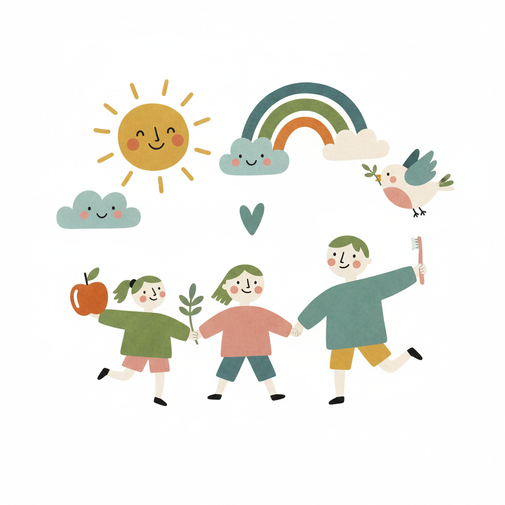 Kinder spielen fröhlich unter Sonne und Regenbogen.