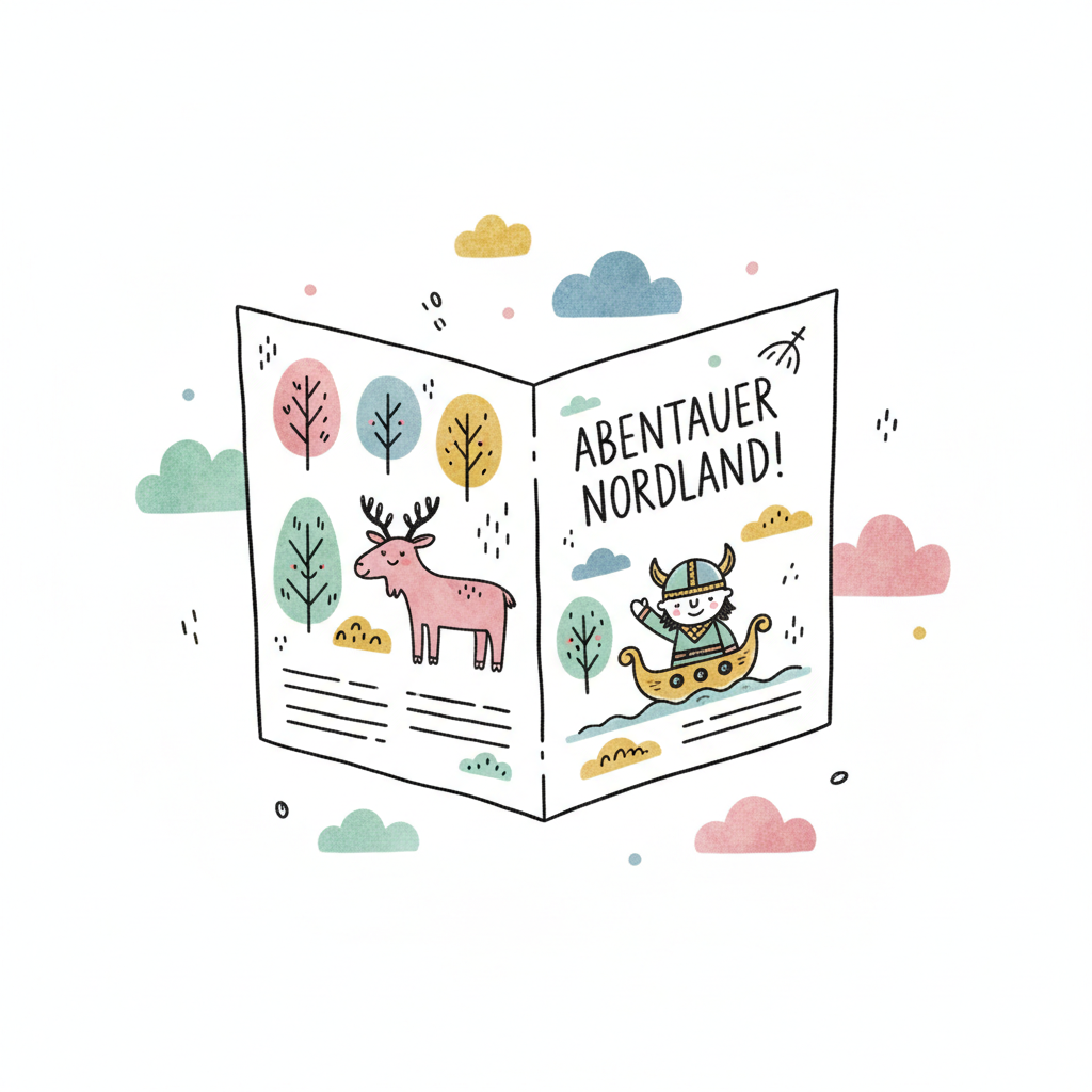 Niedliche Illustration eines offenen Buches "Abenteuer Nordland!" mit Elch und Wikingerkind.