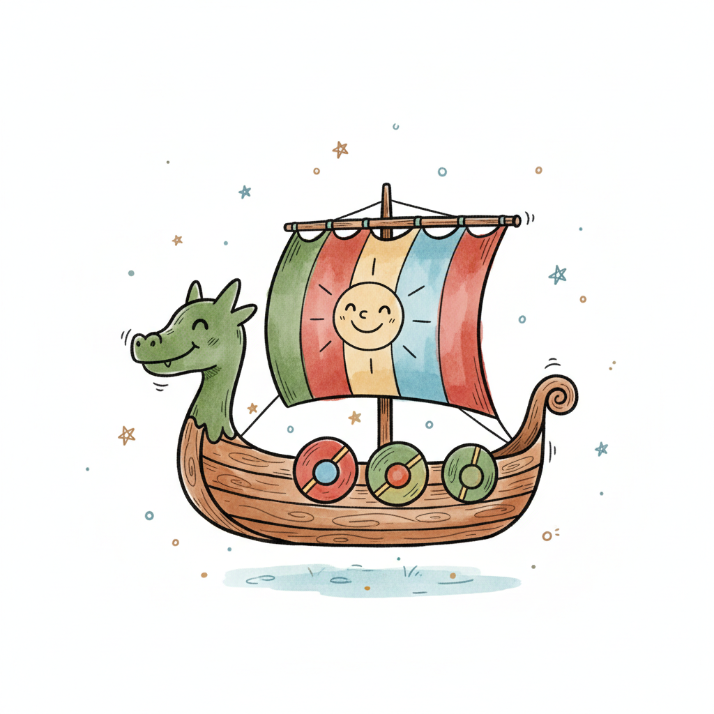 Niedliches Wikingerschiff mit Drachenkopf und buntem Segel mit lachender Sonne, im Kinderbuchstil.