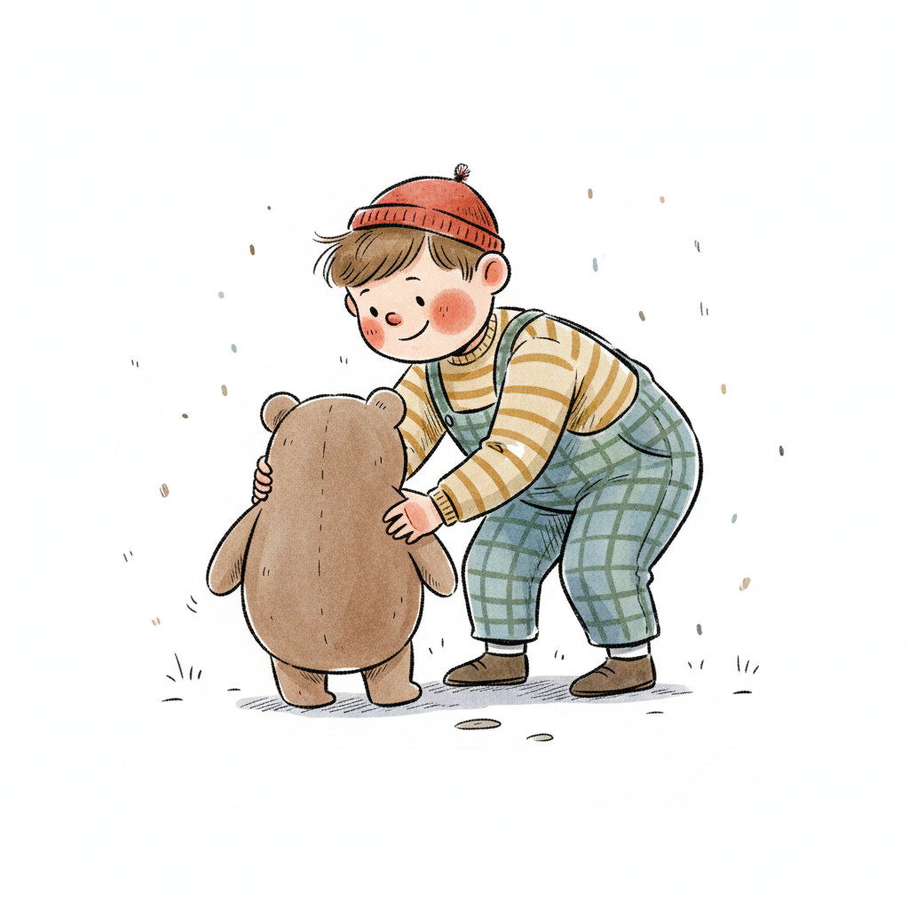 Niedlicher Junge mit Mütze und Latzhose umarmt einen Teddybär von hinten. Kinderbuch-Stil.