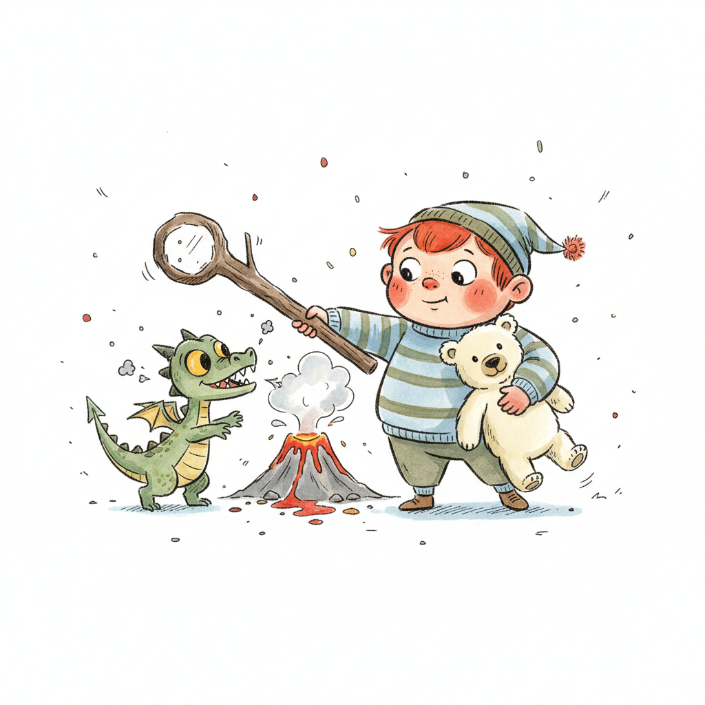 Kind in Mütze erzählt kleinen Fantasiewesen eine Geschichte mit einem Stock.