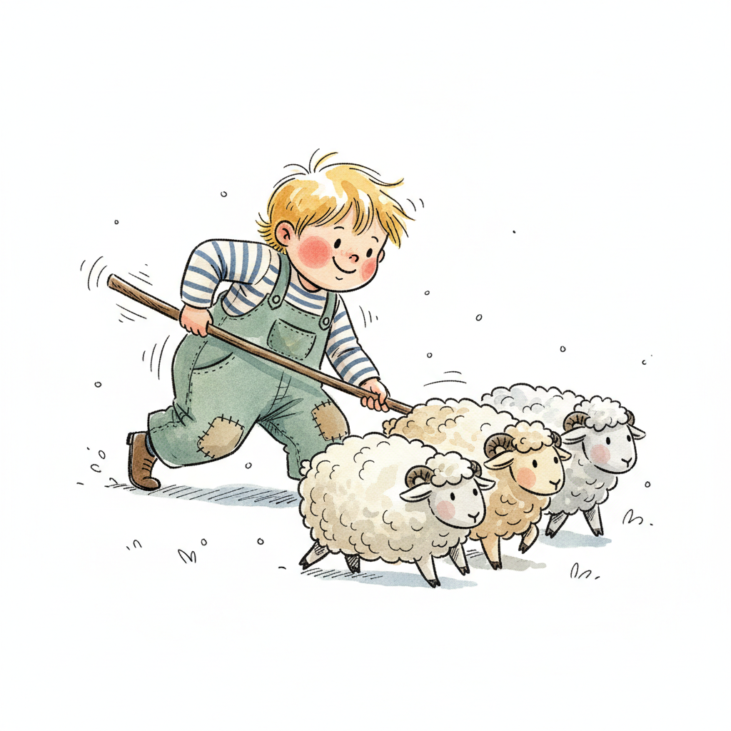 Fröhlicher Junge in Latzhose hütet drei Schafe mit einem Stock. Kinderbuchstil.
