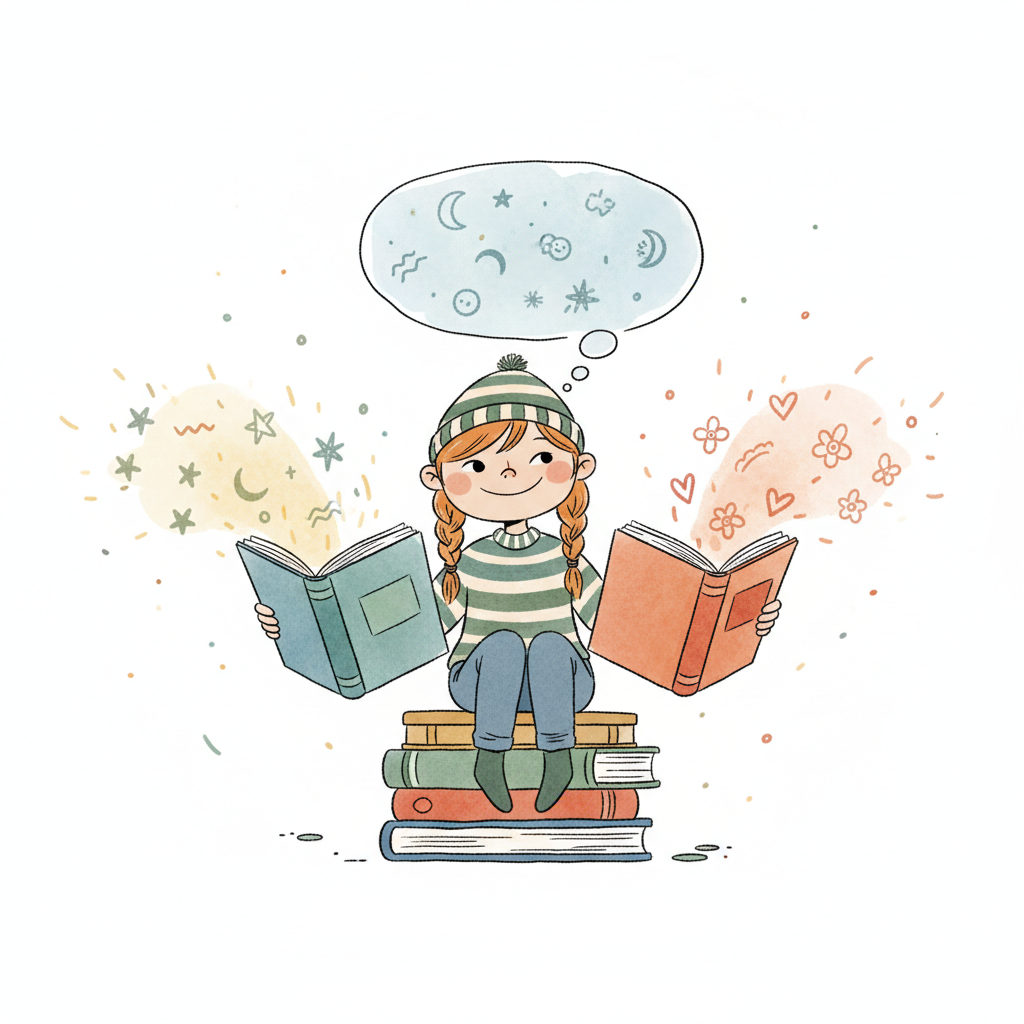Mädchen sitzt auf Büchern, liest zwei und träumt von Sternen, Monden, Herzen und Blumen.