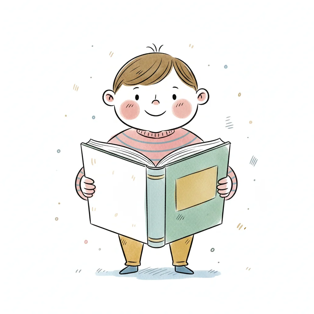 Ein lächelnder Cartoon-Junge mit braunen Haaren und roten Wangen hält ein offenes Buch.
