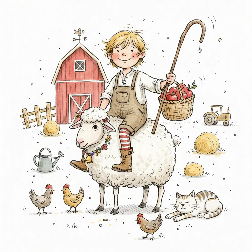 Fröhlicher Junge reitet auf Schaf mit Apfelkorb auf Bauernhof, umgeben von Tieren und Scheune.