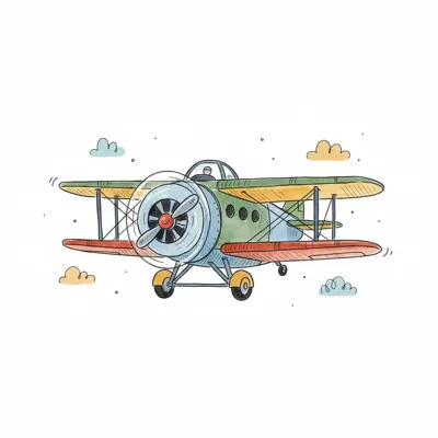 Buntes Aquarell-Doppeldeckerflugzeug mit Pilot und Wolken, im Kinderbuchstil gezeichnet.