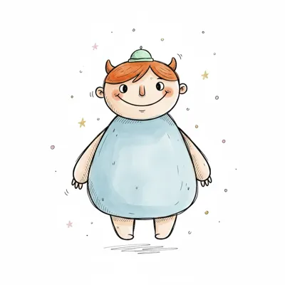 Fröhliche, rundliche Cartoon-Figur mit rotem Haar und blauem Outfit, umgeben von Sternen.