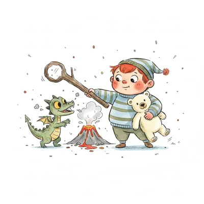 Junge mit Teddy, Drache und Vulkan spielen Abenteuer mit einem Vergrößerungsglas.