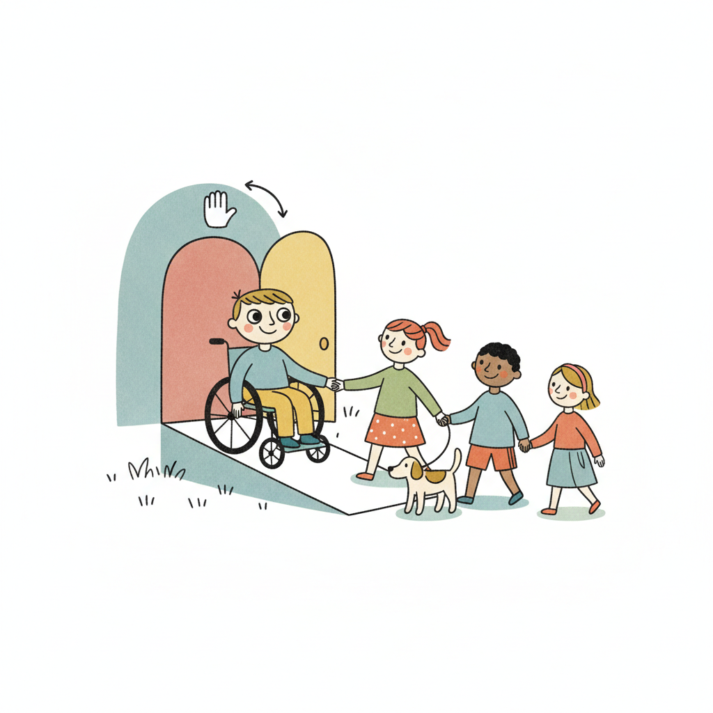 Fröhliche Kindergruppe, inkl. Rollstuhlfahrer, verlässt Gebäude über Rampe, hält Händchen.