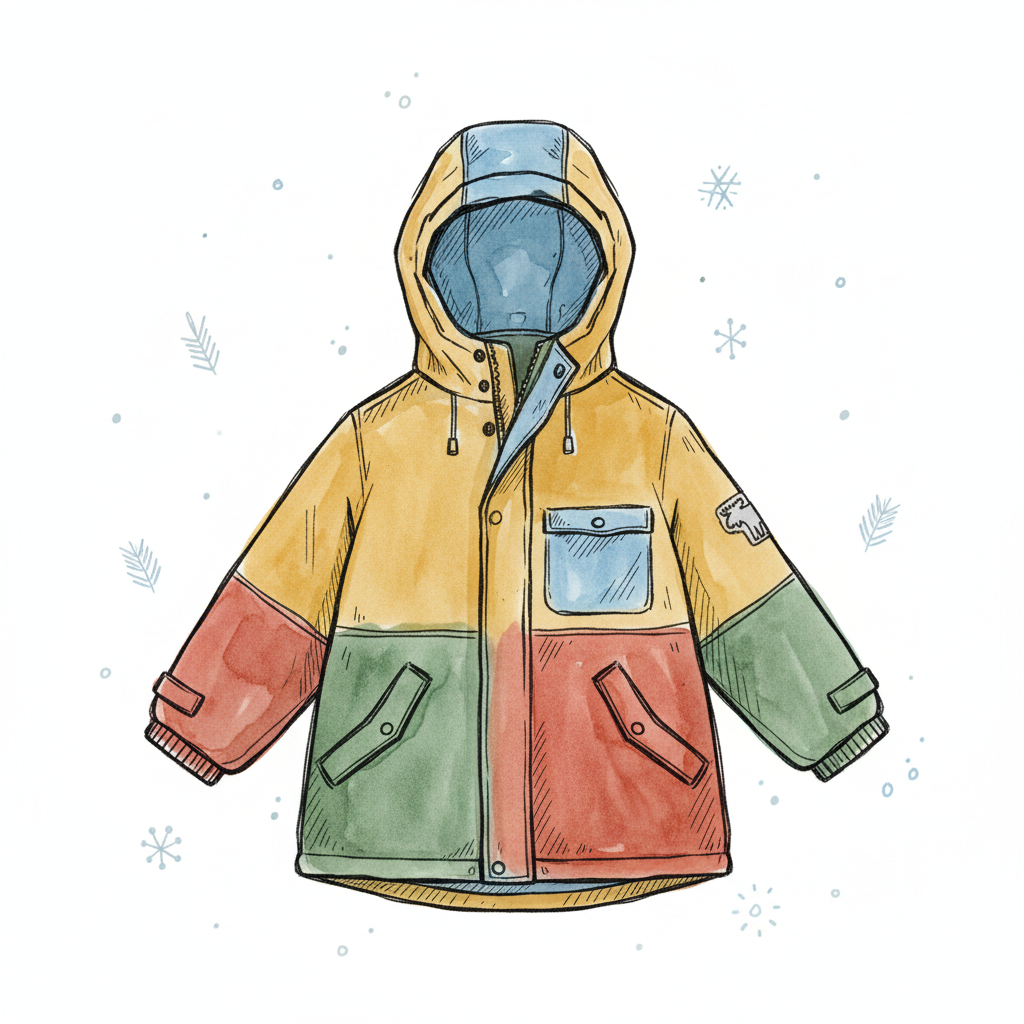 Bunte Kinderwinterjacke mit Kapuze im Aquarellstil, umgeben von Schneeflocken.