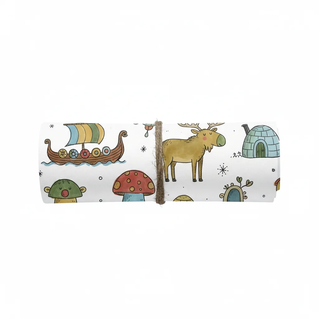 Gerolltes Produkt mit skandinavischen Motiven: Wikingerschiff, Elch, Iglu, Pilze.
