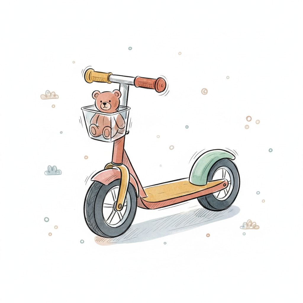 Illustration eines bunten Kinderrollers mit drei Rädern auf weißem Hintergrund.