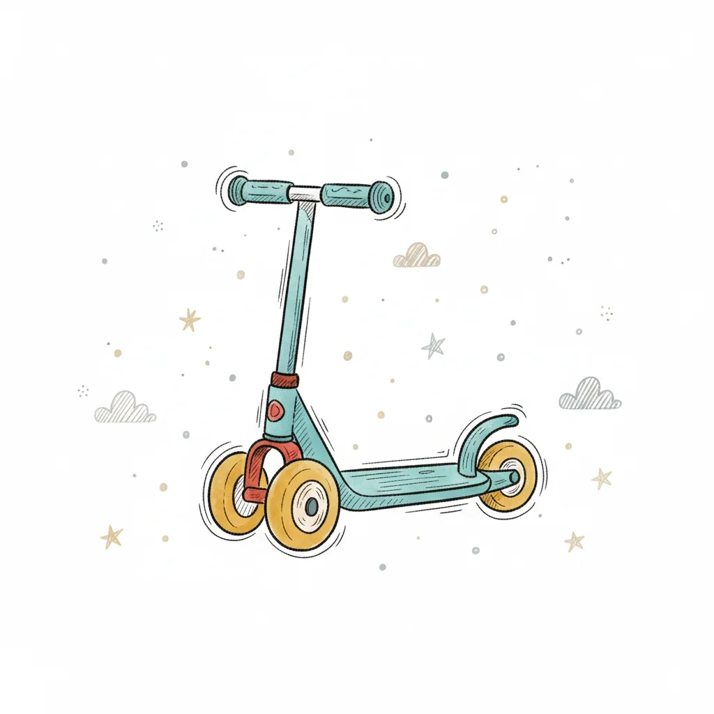 Handgezeichneter Kinderroller in Türkis mit gelben Rädern auf weißem Hintergrund mit Sternen.