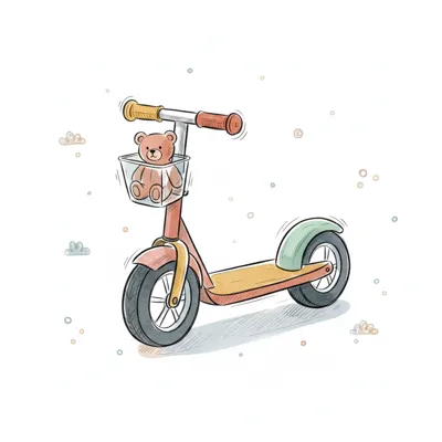 Niedlicher Kinderroller mit einem Teddybär im Korb, gezeichnet im Aquarellstil.