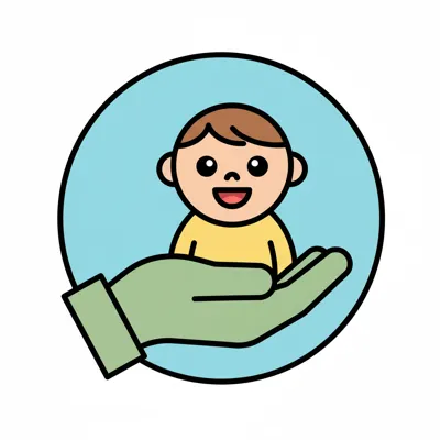 Ein lächelndes Kind wird von einer großen Hand gehalten, symbolisiert Schutz und Fürsorge.