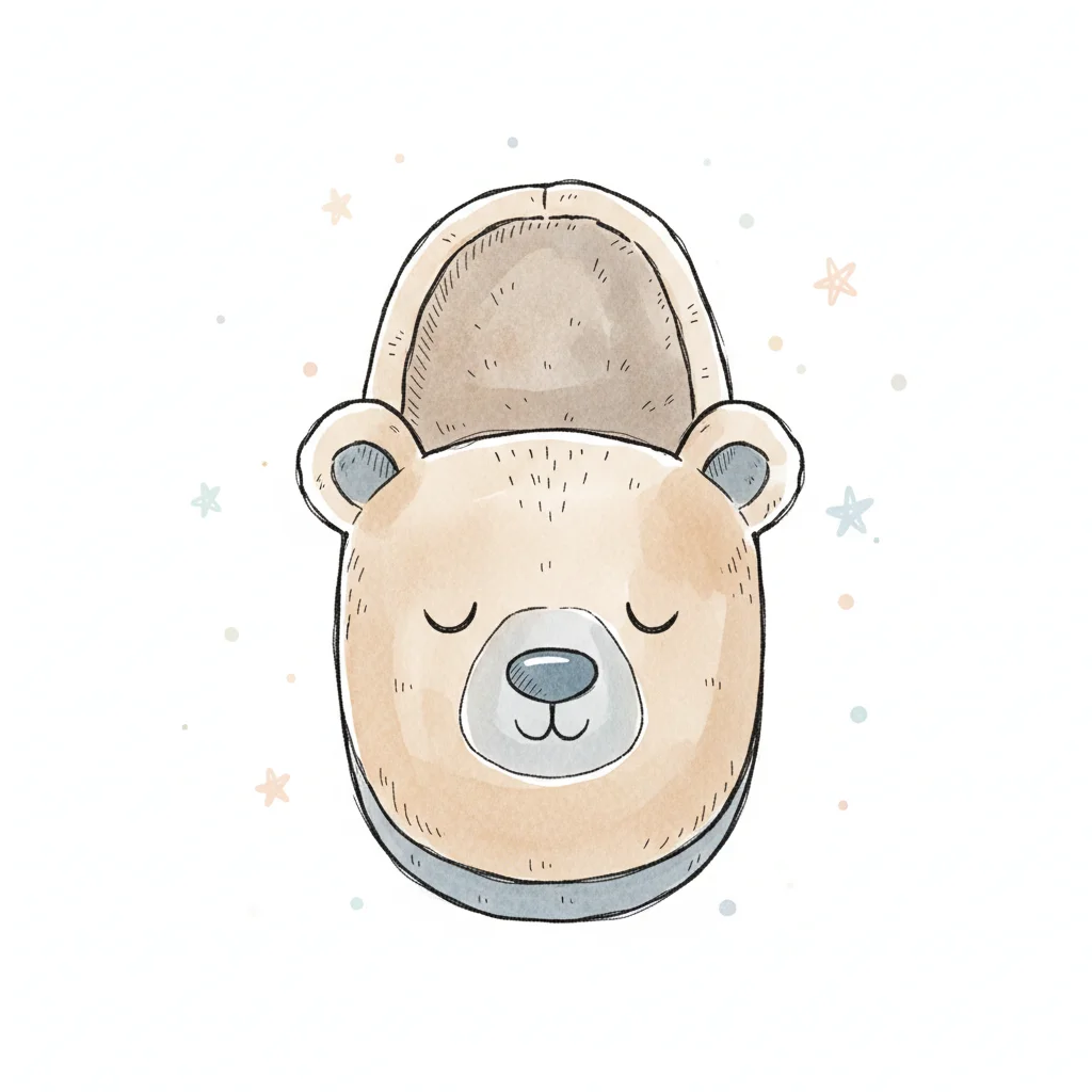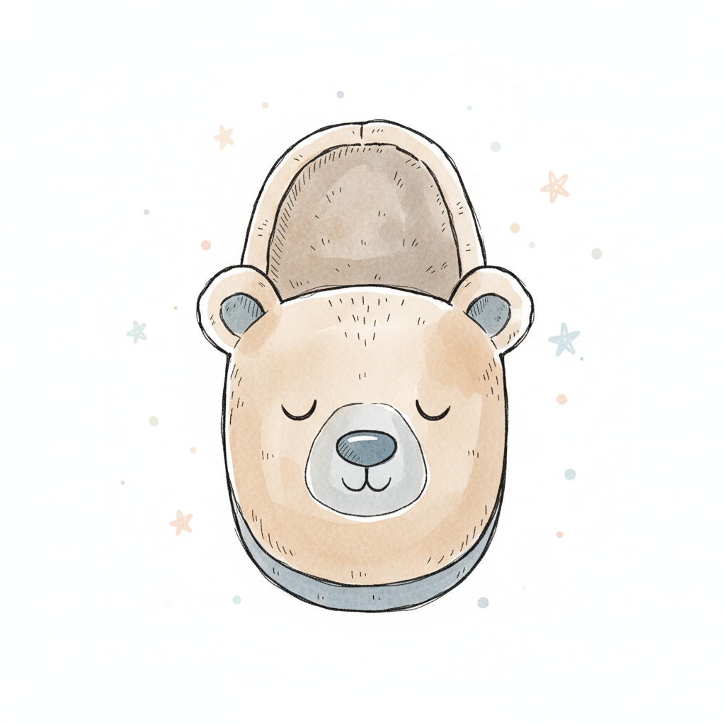 Süße Hausschuhe in Form eines Bären mit geschlossenen Augen.