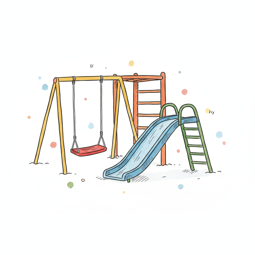 Buntes Spielplatzgerät mit Schaukel und Rutsche.