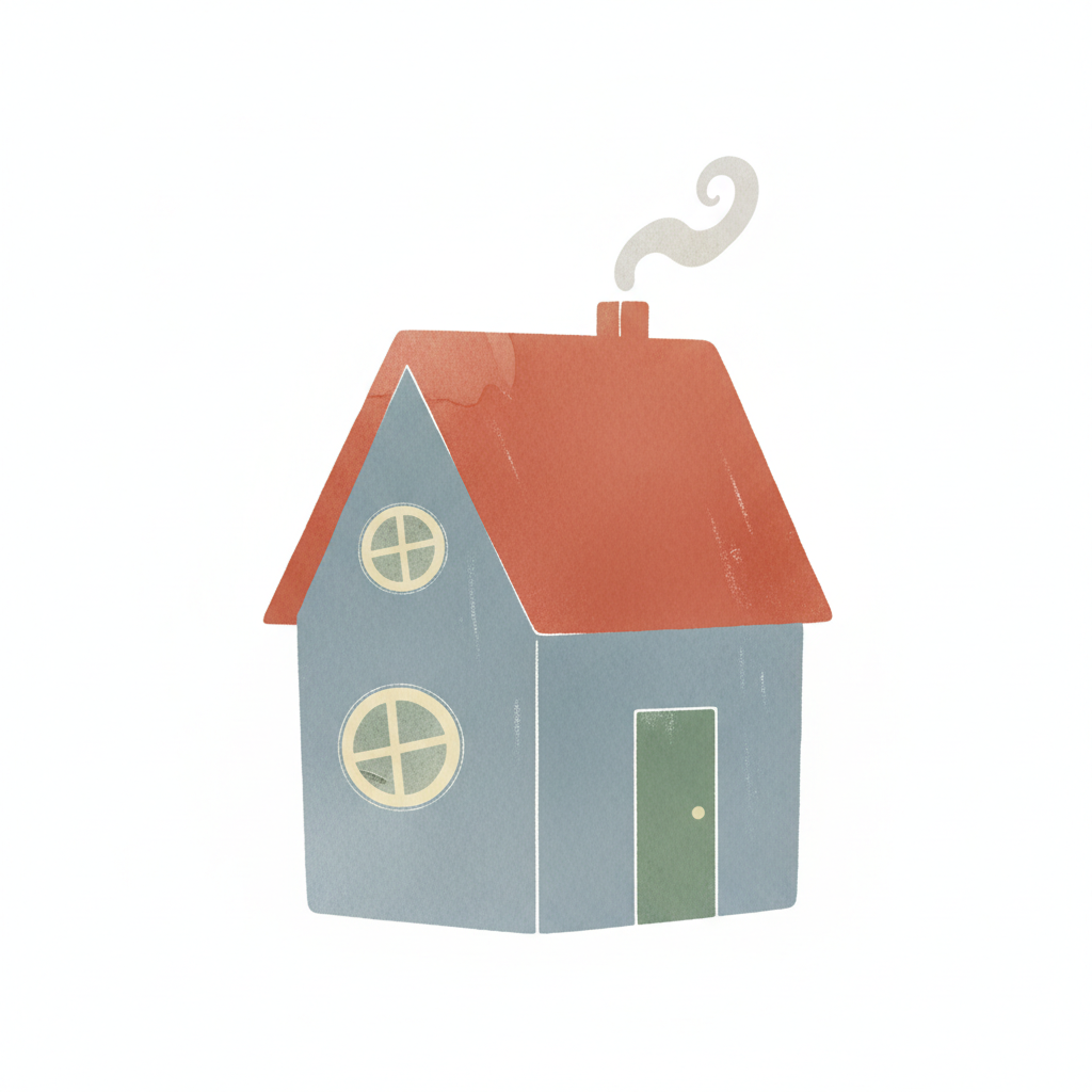 Niedliche Illustration eines blauen Hauses mit rotem Dach und rauchendem Schornstein auf weißem Grund.
