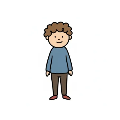 Niedliche Cartoon-Zeichnung eines lächelnden Jungen mit lockigem Haar in blauem Shirt und brauner Hose.