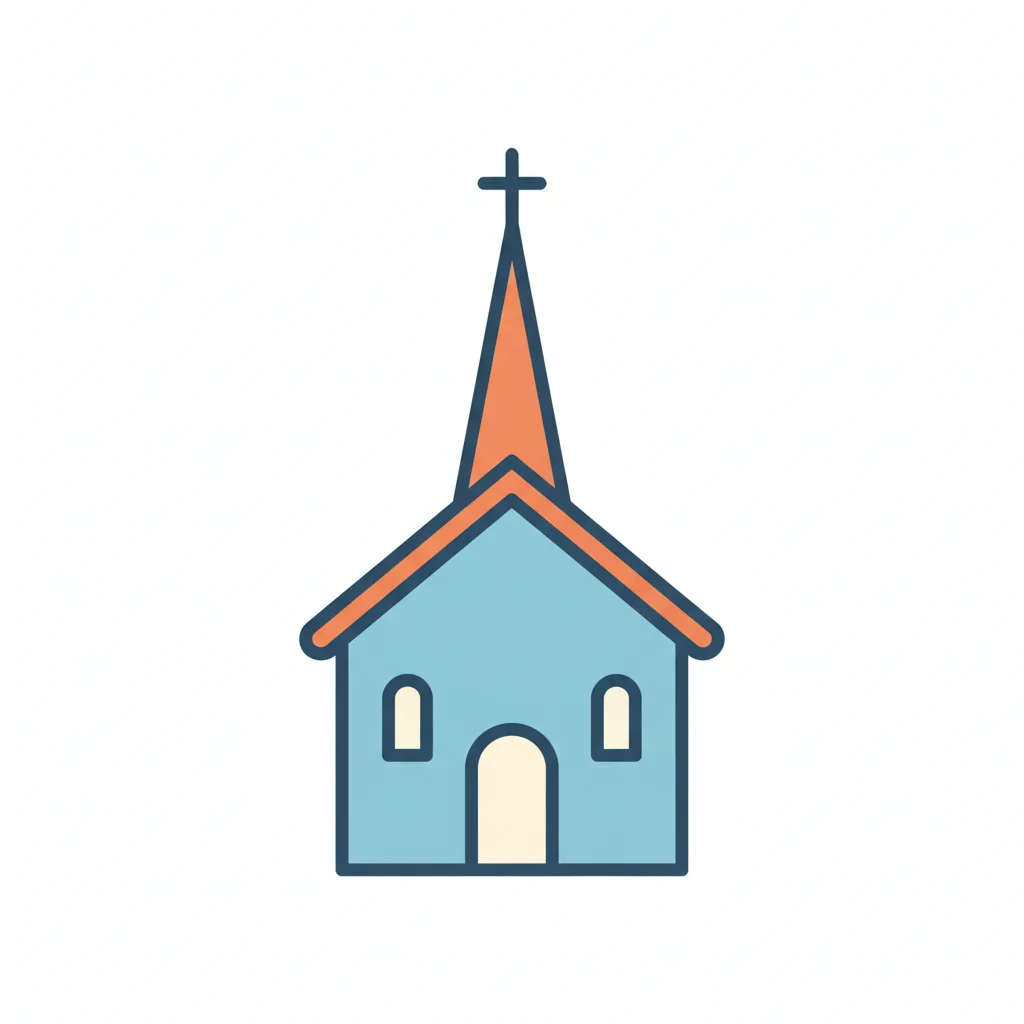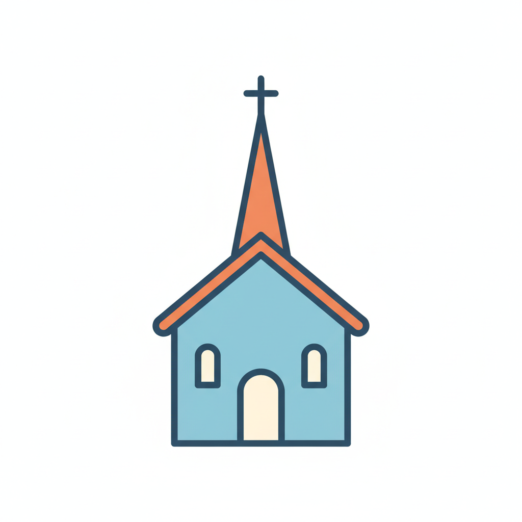 Eine einfache, grafische Darstellung einer Kirche mit einem Kreuz.