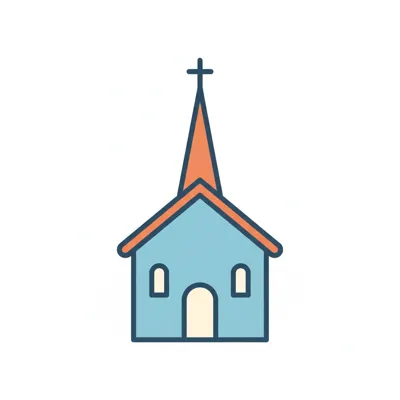 Eine stilisierte Kirche mit spitzem Dach und bunten Fenstern.