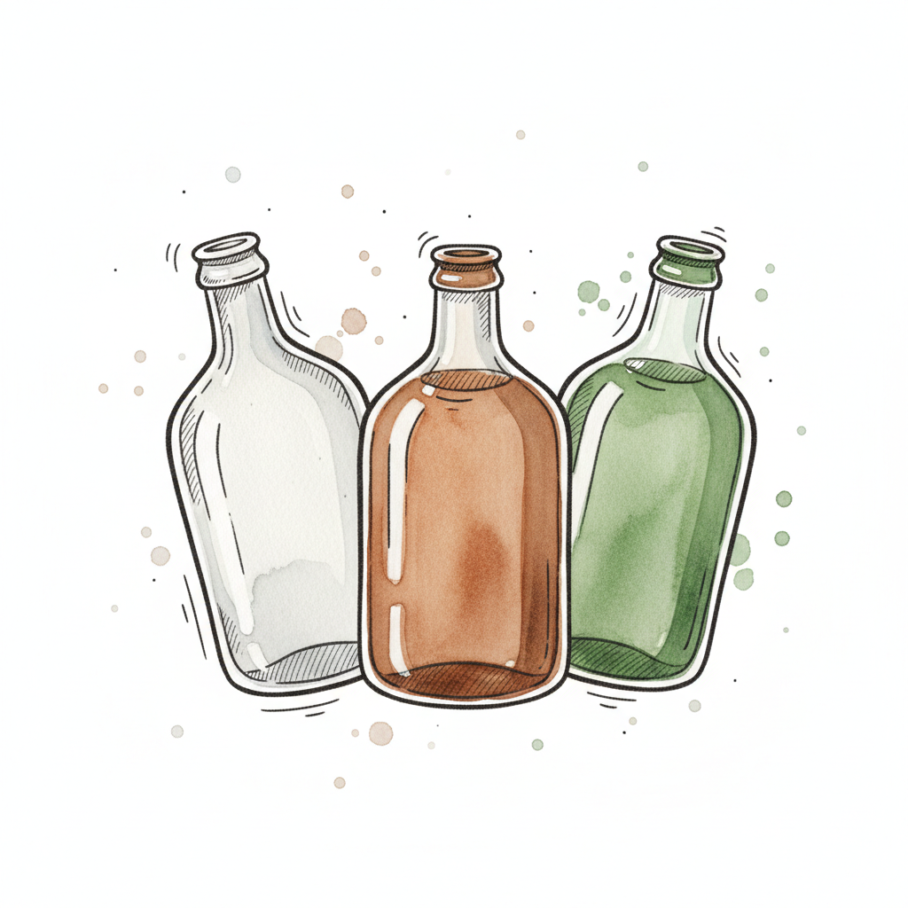 Drei bunte Flaschen in Aquarell-Optik: klar, braun und grün, mit skizzenhaften Umrissen.