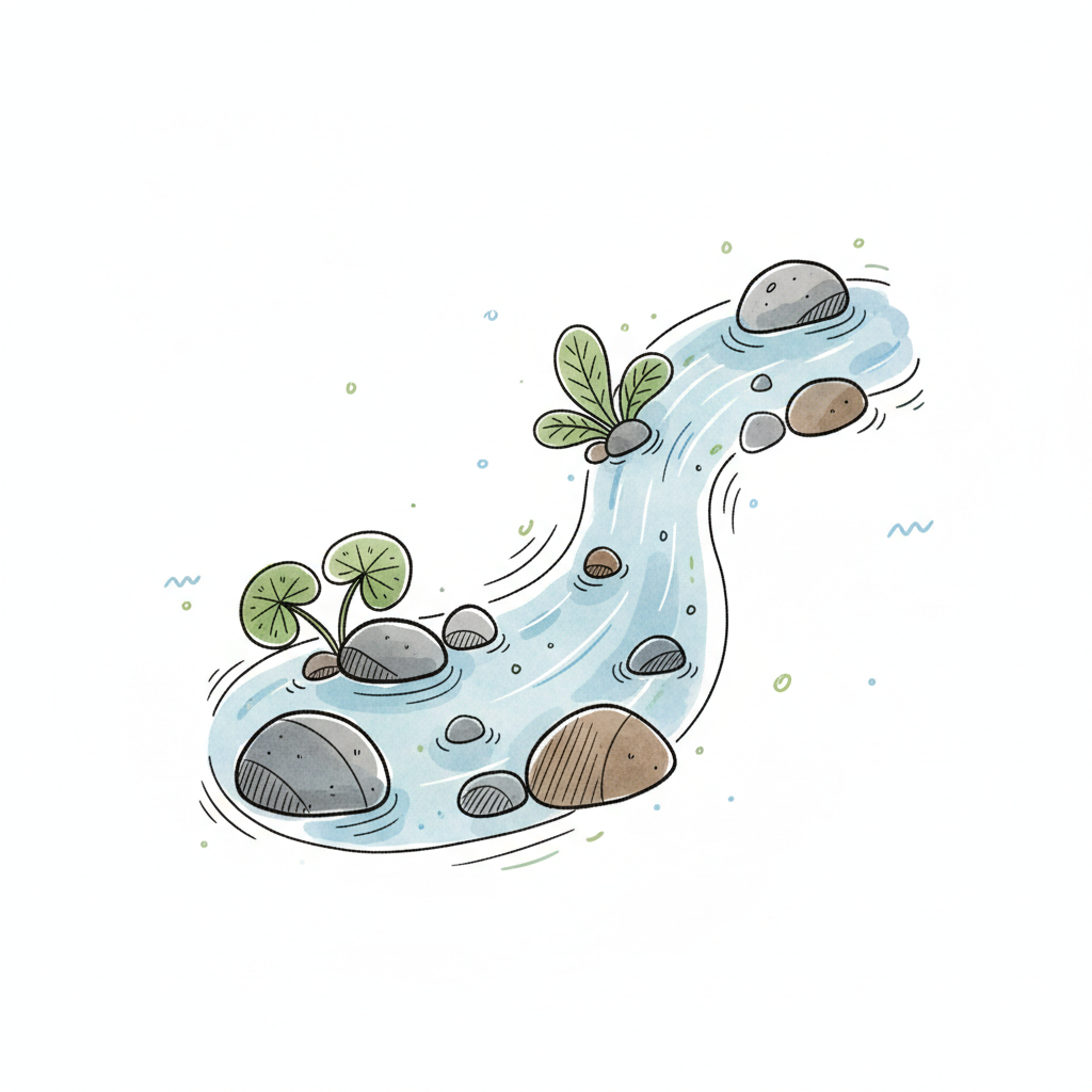 Illustrierter Flusslauf mit Felsen und grünen Pflanzen in klarem Wasser, handgezeichneter Stil.