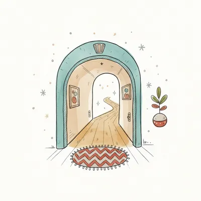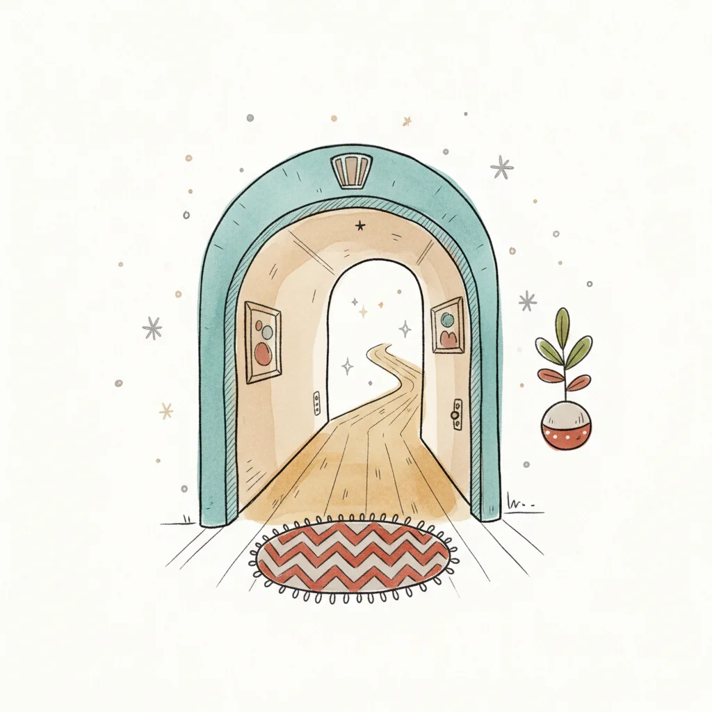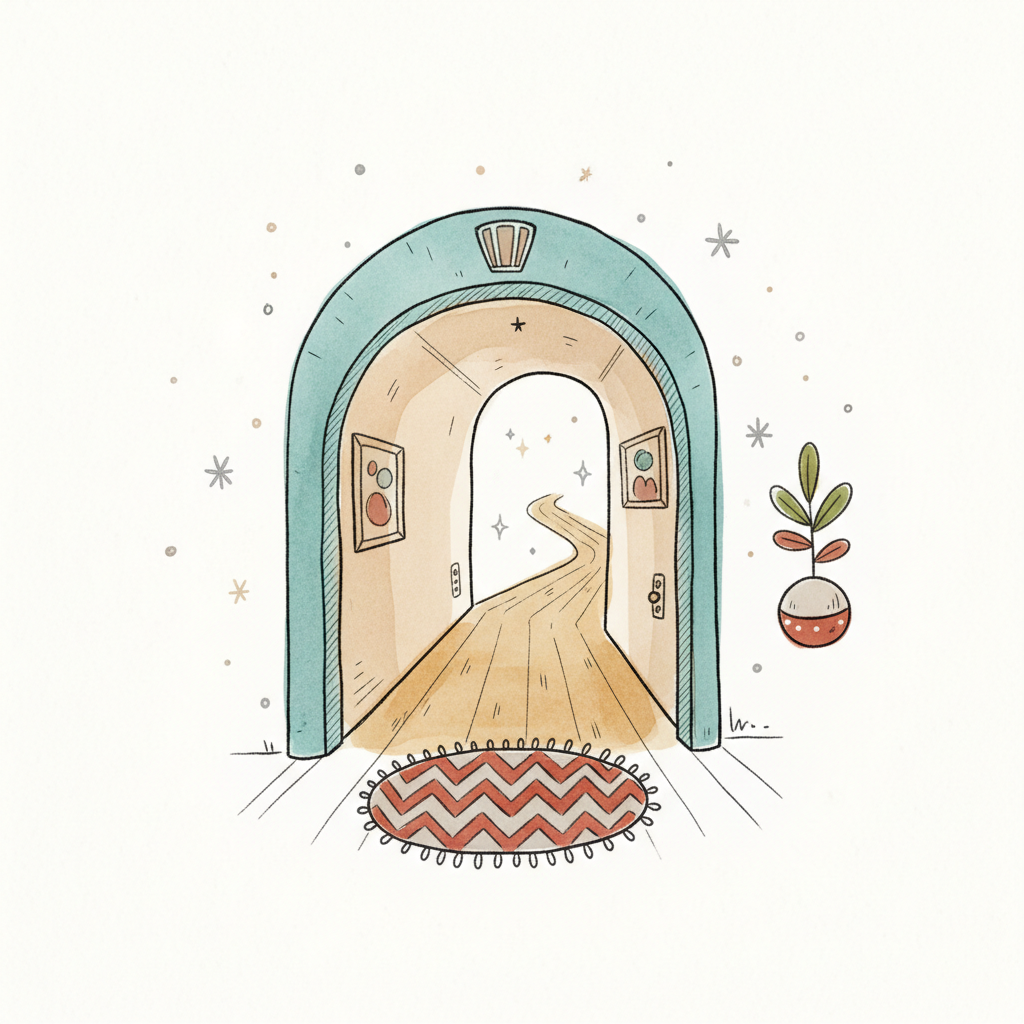 Ein illustrierter, bogenförmiger Durchgang mit einem gewundenen Pfad, der in eine helle, sternenklare Ferne führt.