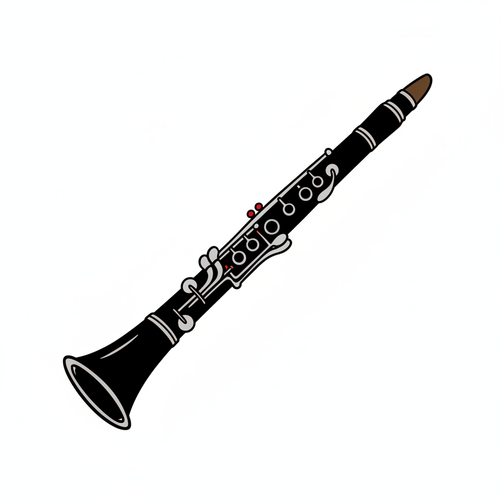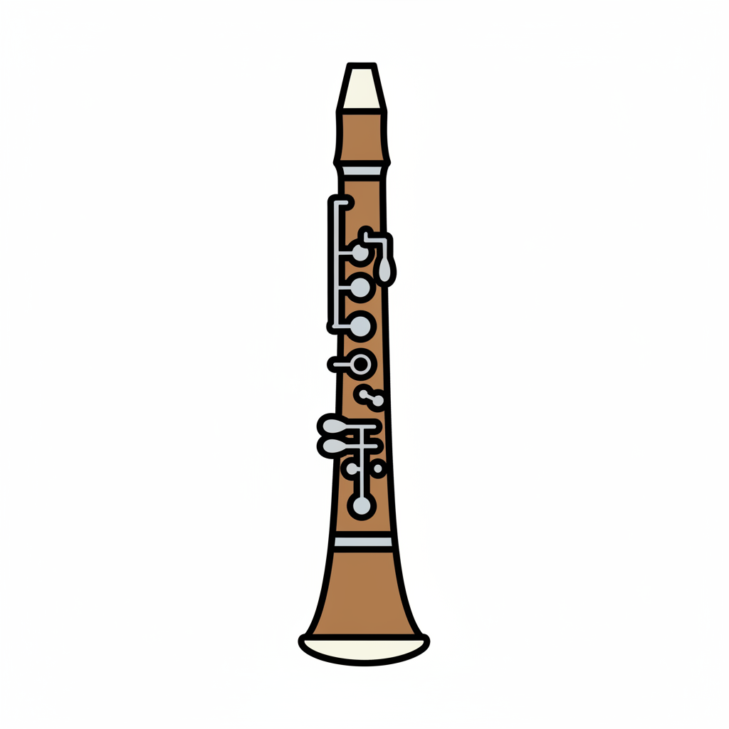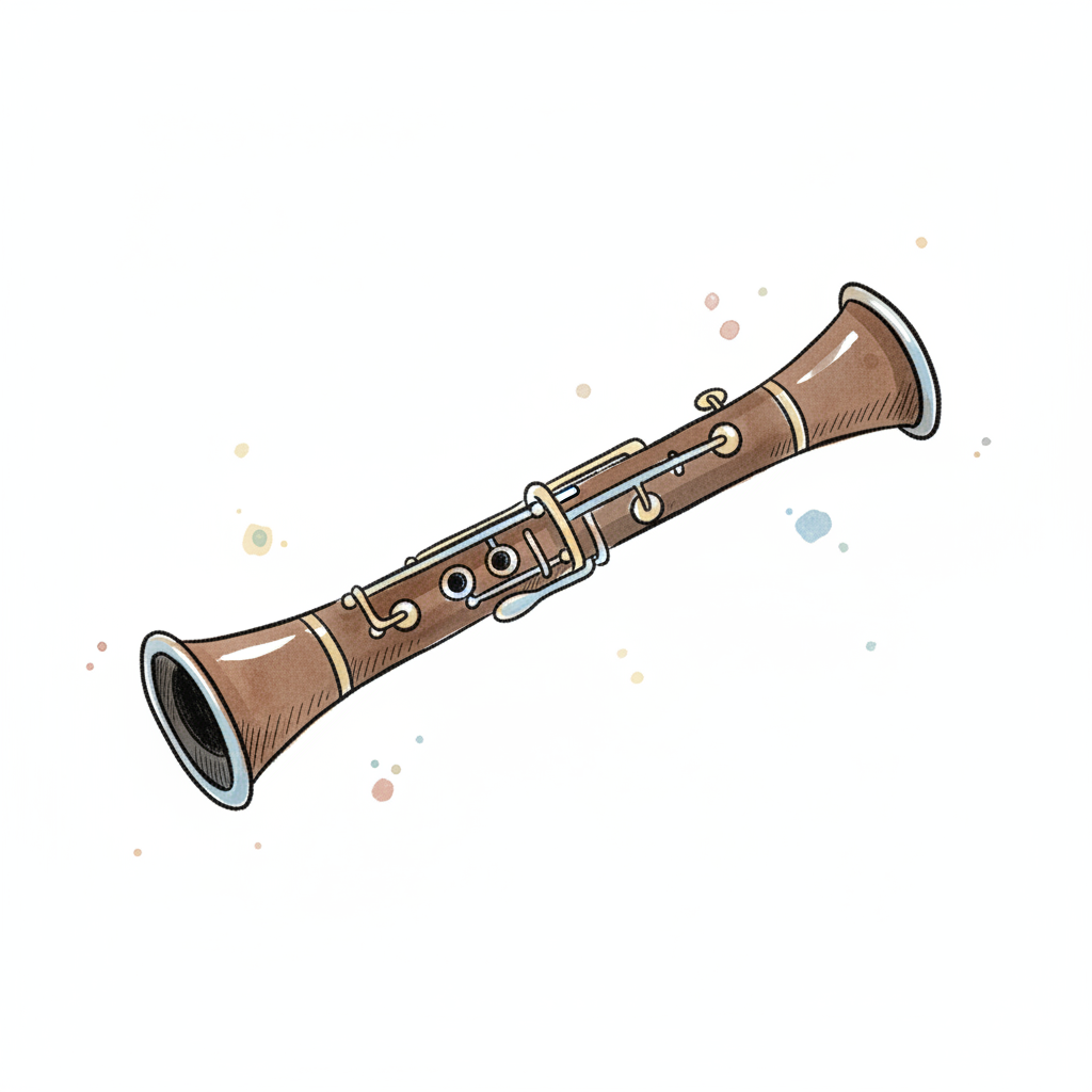 Cartoon-Illustration einer braunen und cremefarbenen Klarinette mit silbernen Klappen auf weißem Hintergrund.