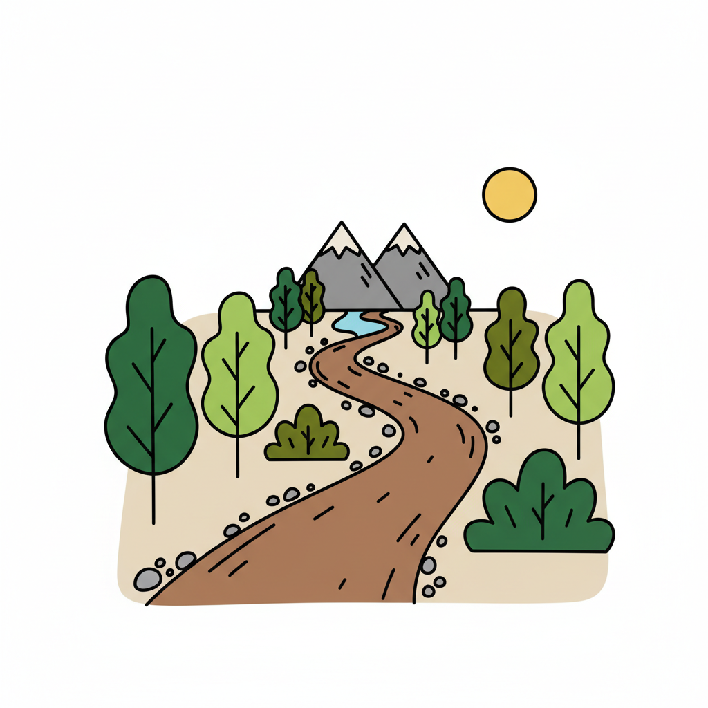 Stilisierte Naturlandschaft: Weg, Bäume, Berge, Fluss und Sonne unter klarem Himmel.