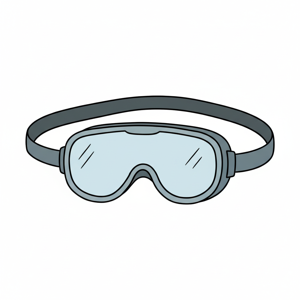 Eine graue Schutzbrille mit klaren Gläsern und einem Band, im Cartoon-Stil.