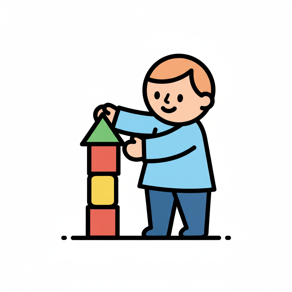 Fröhliches Kind baut einen Turm aus farbigen Bauklötzen. Einfache, klare Illustration.