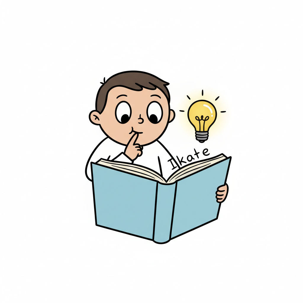 Junge liest Buch, bekommt eine Idee (Glühbirne), Finger am Mund.
