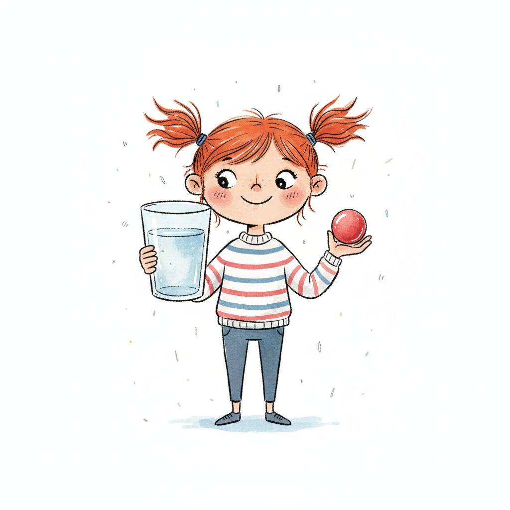 Lächelndes Mädchen mit roten Zöpfen hält ein Wasserglas und einen roten Ball.