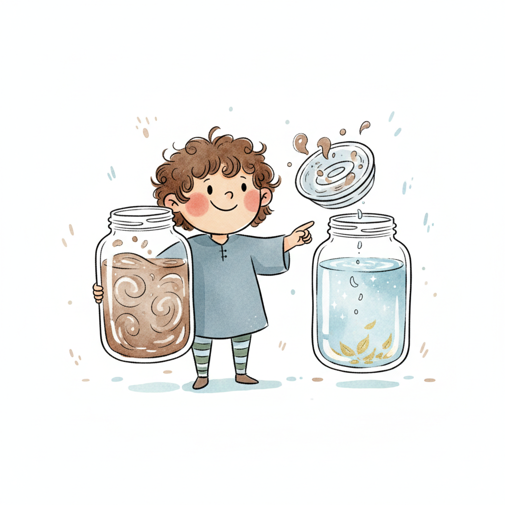 Kind vergleicht zwei Gläser: eines mit trüber, eines mit klarer Flüssigkeit und Blättern.