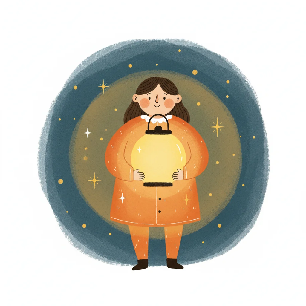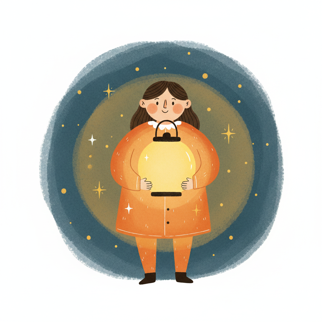 Cartoonmädchen hält leuchtende Laterne in dunkler, sternenklarer Nacht. Warme Illustration.