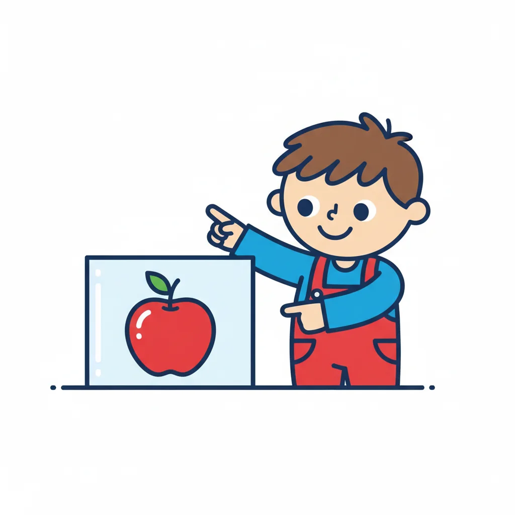 Ein Cartoon-Junge zeigt auf ein Bild eines roten Apfels.